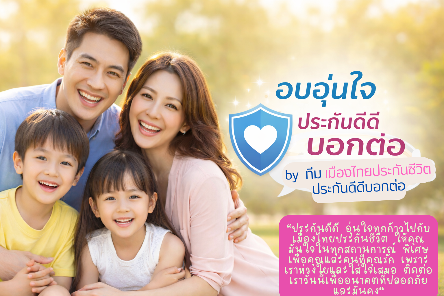 "หนึ่งในการวางแผนความมั่นคงระยะยาวที่ดีที่สุด คือการเริ่มต้นตั้งแต่วันนี้ เมืองไทยประกันชีวิต พร้อมอยู่เคียงข้างคุณ เพื่อสร้างหลักประกันที่มั่นคง ให้คุณและคนที่คุณรักในทุกช่วงของชีวิต"